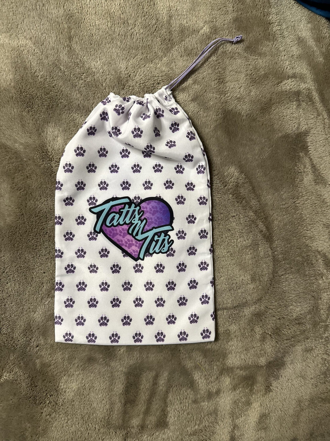 Tatts N Tits logo bag with purple paw prints all over and a purple tie...