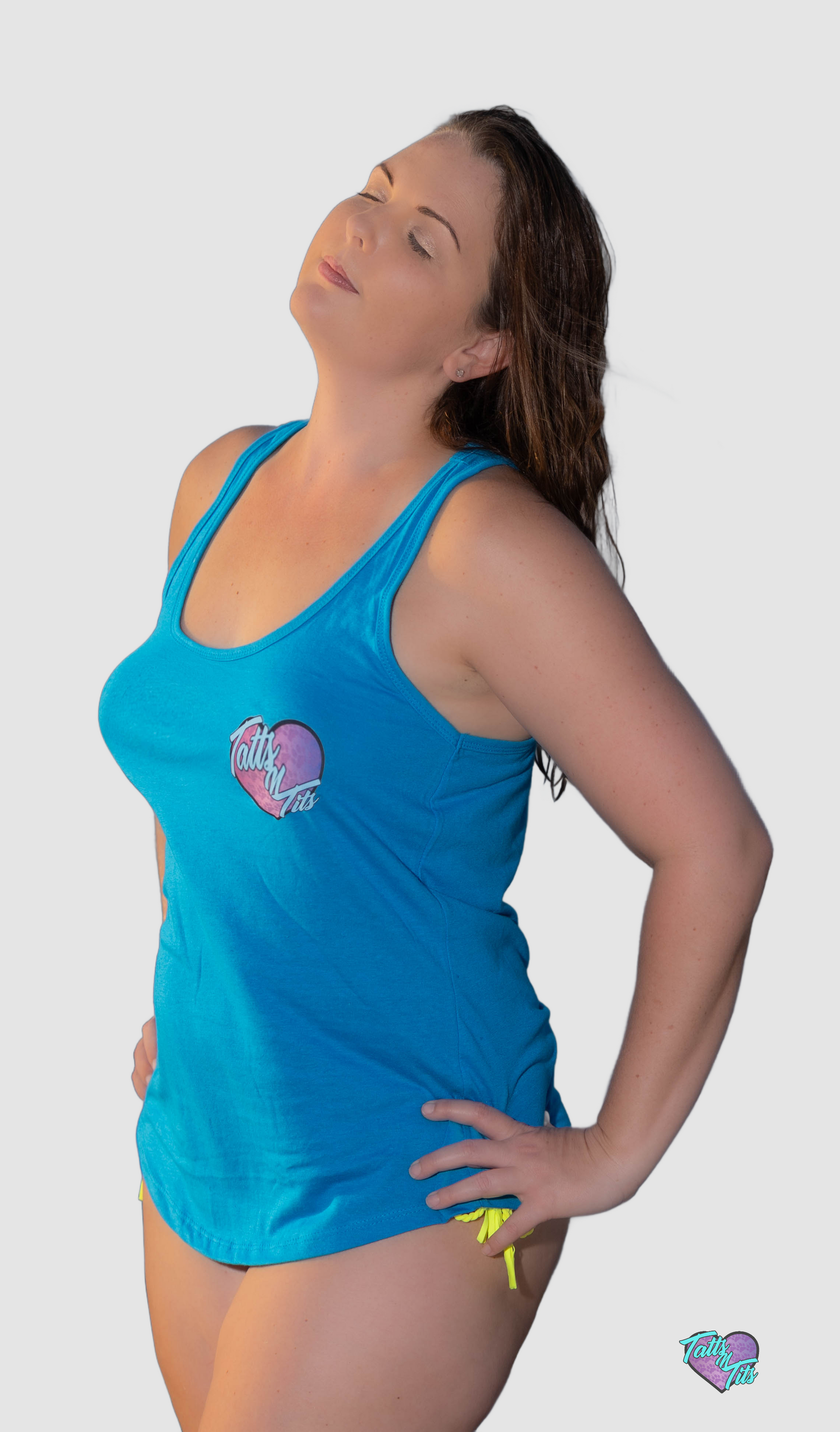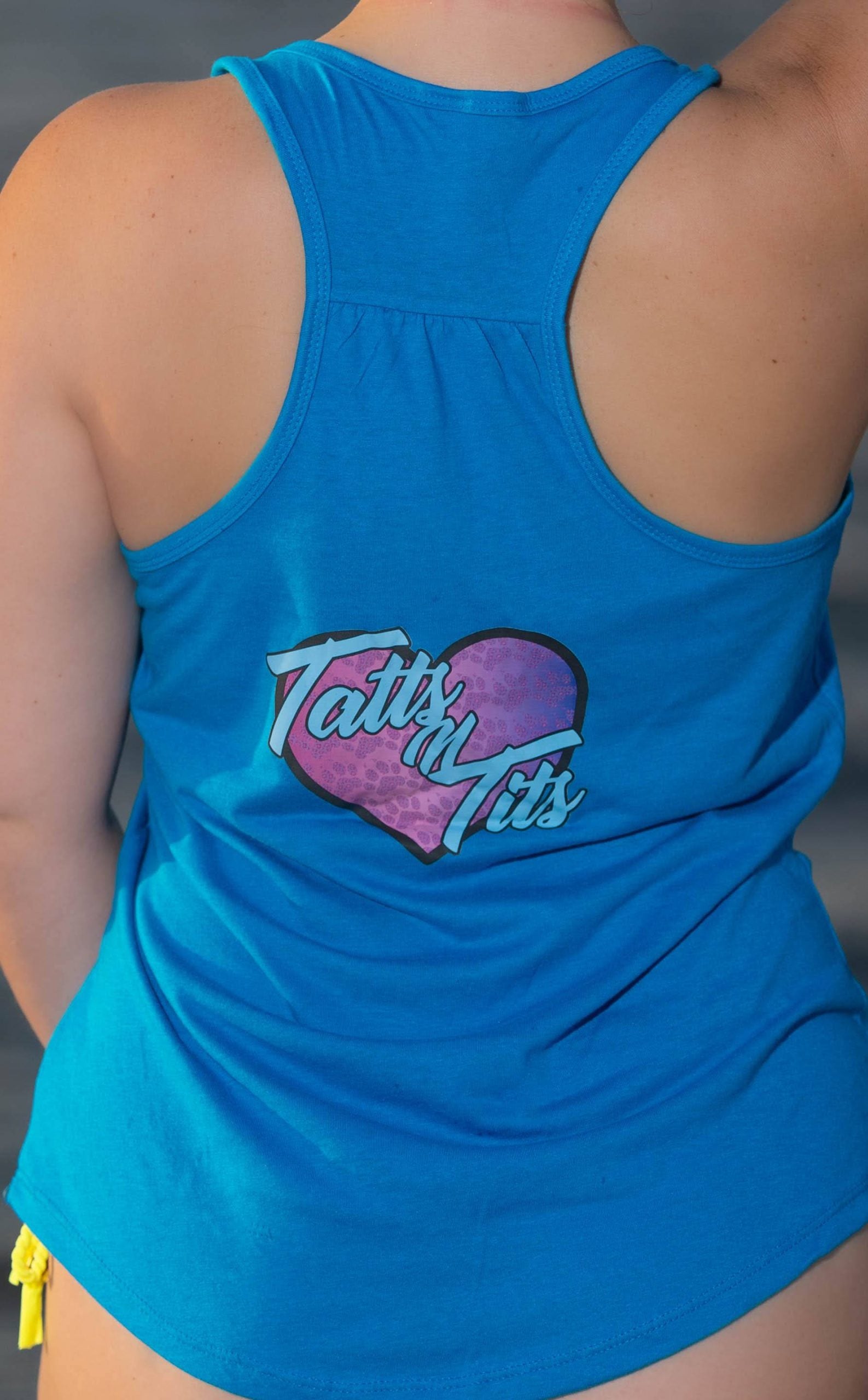 Turquoise Racerback tank top with Tatts N Tits Logo’d, for tight fit order size smaller, for baggy fit order true to size